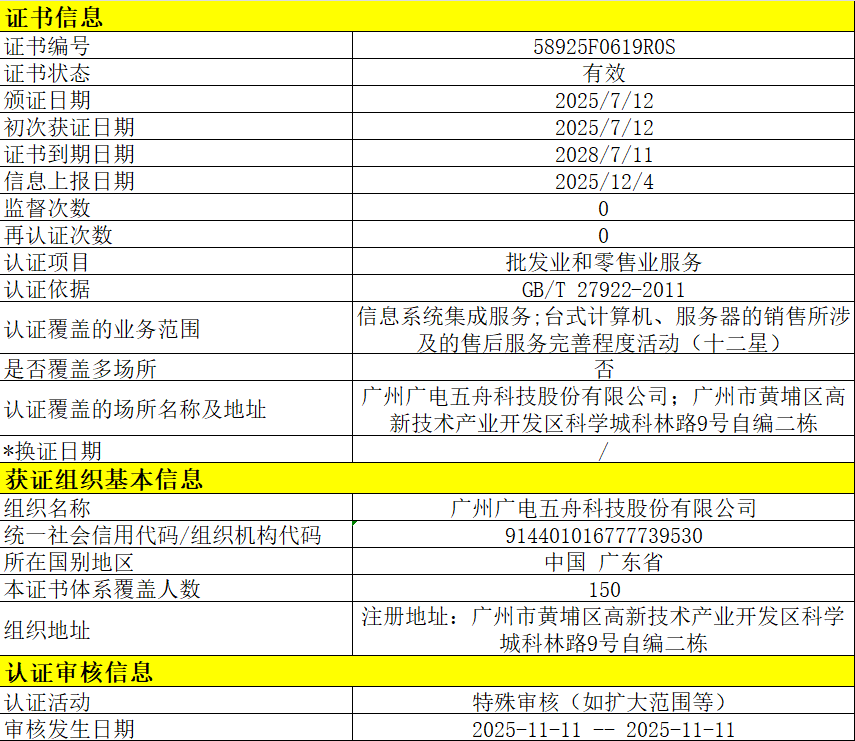 广州广电五舟科技股份有限公司 58925F0619R0S