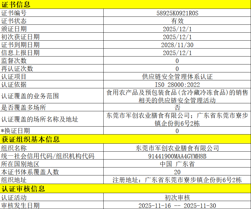 东莞市军创农业膳食有限公司 58925K0921R0S