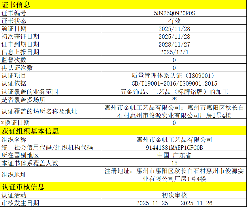 惠州市金帆工艺品有限公司 58925Q0920R0S